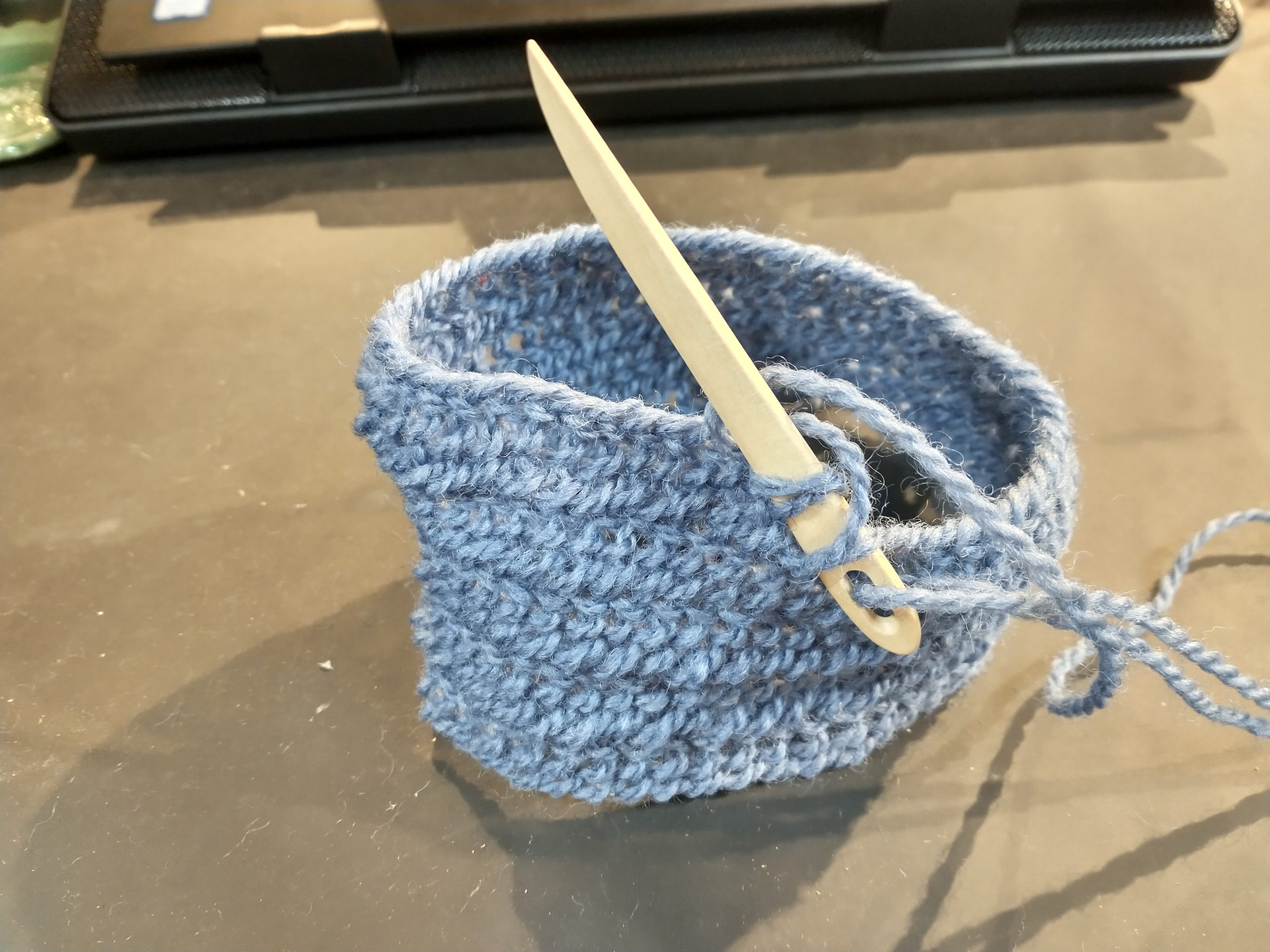 Every year, I like to challenge myself to learn a new fiber arts skill. My recent addition to the toolkit is nalbinding. I know, it’s an odd sort of word, which translates as “needle binding” from Norwegian. Said, “nahl-bihn-ding,” this is a method of making flexible, durable (because they were often wet felted), shapable, wearable textiles with a single, chubby needle that predates the invention of crochet or knitting. Internationally known as “knotless netting,” forms of nalbinding are found all over the world, with different stitches used for fishing nets, gathering baskets, milk strainers, garments etc. The process is extremely low on infrastructure (you just need the needle, no looms or other large gear), portable (easy to pack and take with you), and versatile.